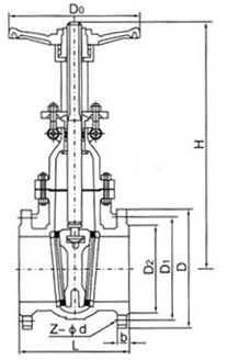 日标不锈钢闸阀外形结构图 Z41H-10K日标不锈钢闸阀主要尺寸和重量| DN(mm) | in | L | D | D1 | D2 | b | n-φd | H | D0 | W(kg) | | 50 | 2 | 178 | 155 | 120 | 100 | 16 | 4-19 | 409 | 200 | 24 | | 65 | 21/2 | 190 | 175 | 140 | 120 | 18 | 4-19 | 535 | 250 | 31 | | 80 | 3 | 203 | 185 | 150 | 130 | 18 | 8-19 | 570 | 250 | 40 | | 100 | 4 | 229 | 210 | 175 | 155 | 18 | 8-19 | 590 | 250 | 55 | | 150 | 6 | 267 | 280 | 240 | 215 | 22 | 8-23 | 630 | 300 | 90 | | 200 | 8 | 292 | 330 | 290 | 265 | 22 | 12-23 | 960 | 350 | 145 | | 250 | 10 | 330 | 400 | 355 | 325 | 24 | 15-25 | 1158 | 400 | 230 | | 300 | 12 | 356 | 450 | 400 | 370 | 24 | 16-25 | 1378 | 450 | 330 | | 350 | 14 | 381 | 490 | 445 | 415 | 26 | 16-25 | 1543 | 500 | 460 | | 400 | 16 | 406 | 560 | 510 | 475 | 28 | 16-27 | 1738 | 600 | 600 | | 450 | 18 | 432 | 620 | 565 | 530 | 30 | 20-27 | 1959 | 600 | 980 | | 500 | 20 | 457 | 675 | 620 | 585 | 30 | 20-27 | 2214 | 680 | 960 |