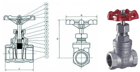 不锈钢螺纹闸阀产品范围: 材质:不锈钢304、不锈钢316 口径:1/2"~3"(DN15~DN80) 连接方式:BSP,BSPT, NPT 压力范围:200WOG 工作温度:0℃ - 80℃ 操作方式:手轮 不锈钢螺纹闸阀结构图: